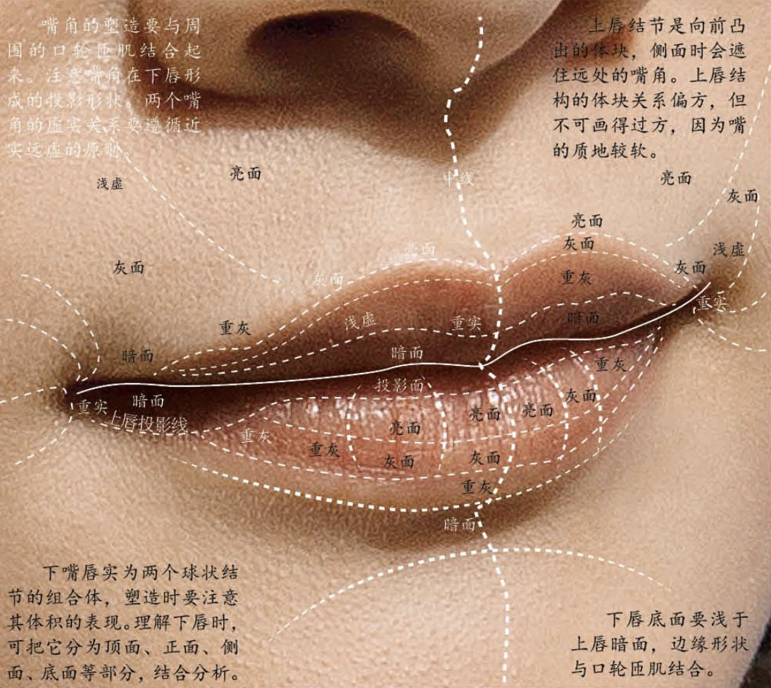 上嘴唇為“M”形,下嘴唇為“W”形,口裂線是有一定起伏,因人而異。任何角度,嘴巴的透視要以人中為界,畫出近大遠小透視關系,人中在嘴唇正上方,注意亮面有微弱區分。嘴角像蘋果窩的凹坑,上下唇的結構有微妙起伏。