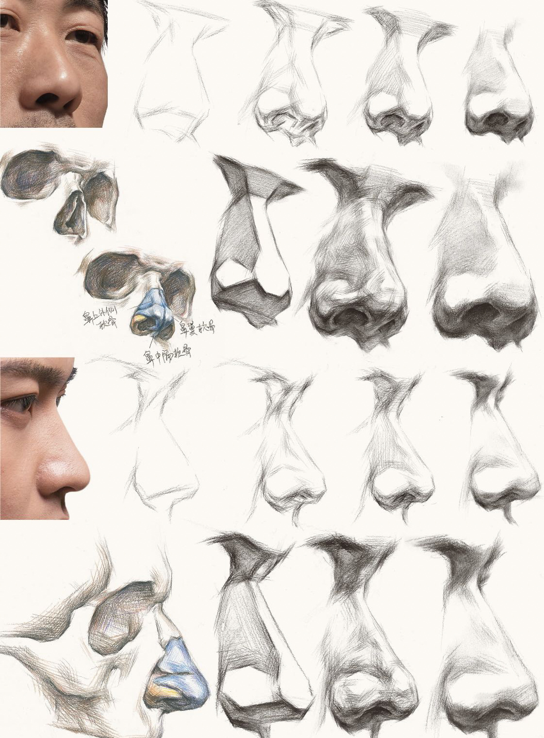 鼻部成三角隆起,分鼻底和基底兩部分,鼻根隆起的是鼻梁,鼻子是梯形棱柱,鼻頭是一個小球體,鼻底朝向要明確,鼻孔不能卡的太死。要畫清楚鼻子的透視和結構。