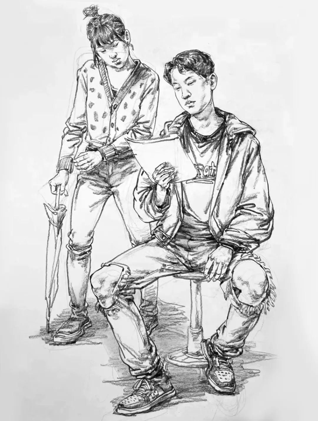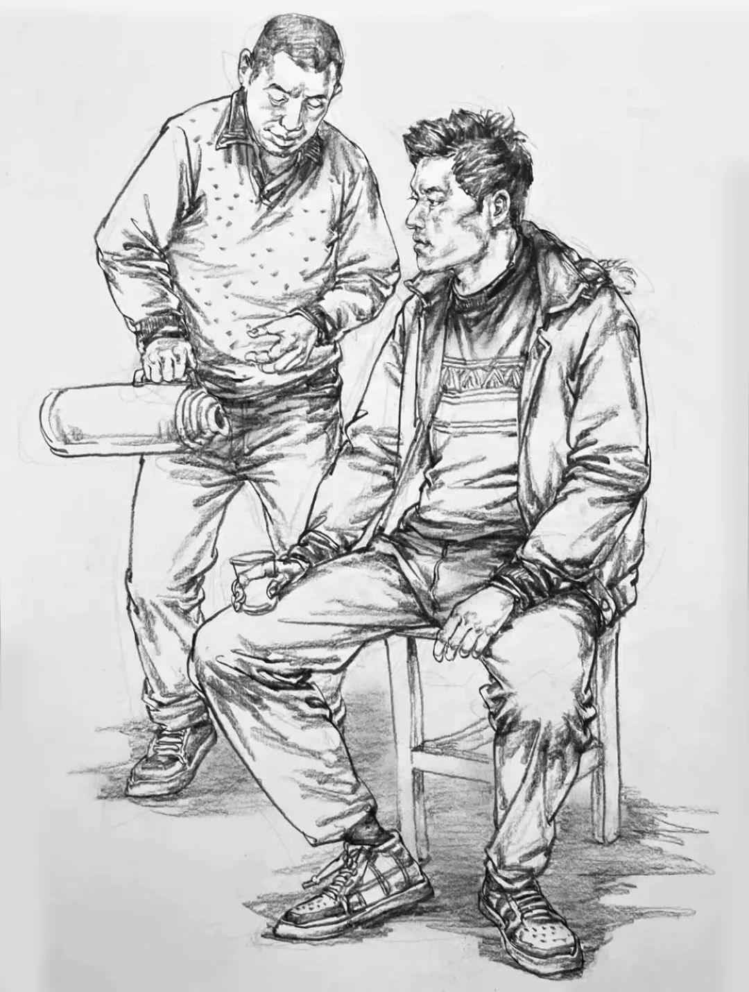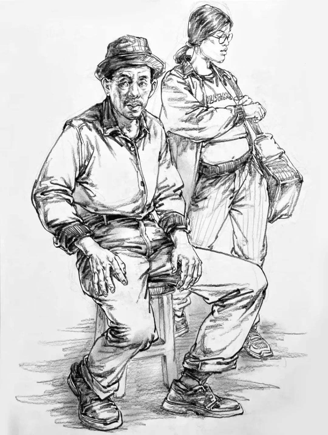 最后是雙人速寫一定要注意比例,因為一般是站姿+坐姿的組合,兩個人本身來說身高、體重、比例就會不一樣,那么我們在把他們組合起來的時候更要注意這些問題,不能看上去不在一個空間里,或者是比例很奇怪,所以空間透視一定要畫對,不然這樣的速寫也是不耐看的。