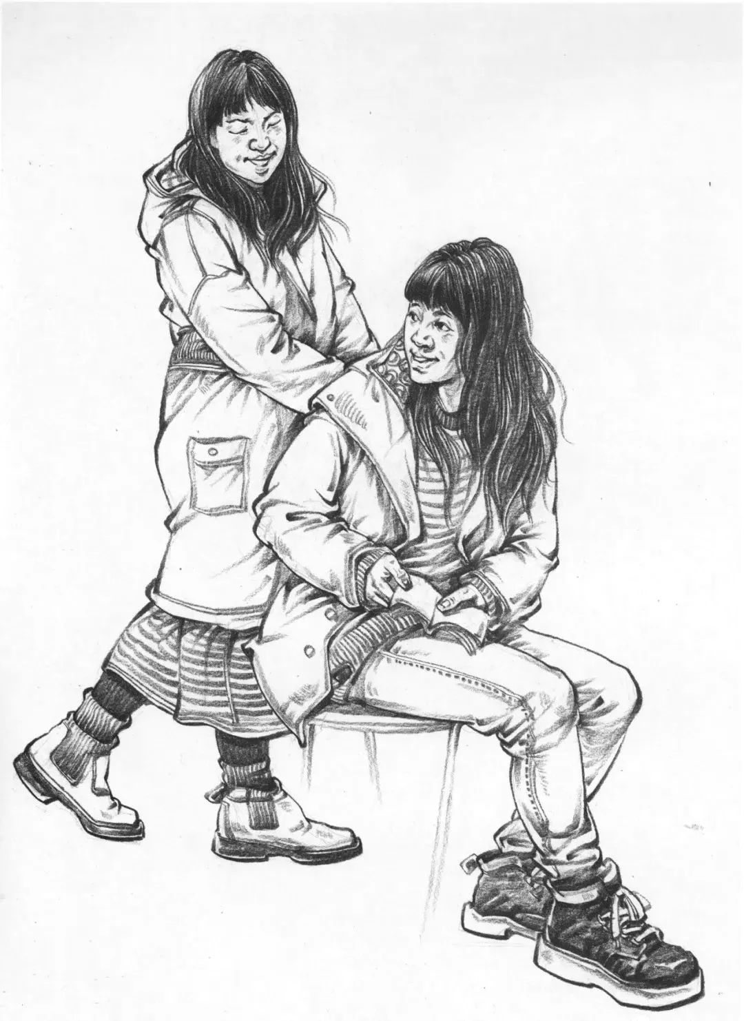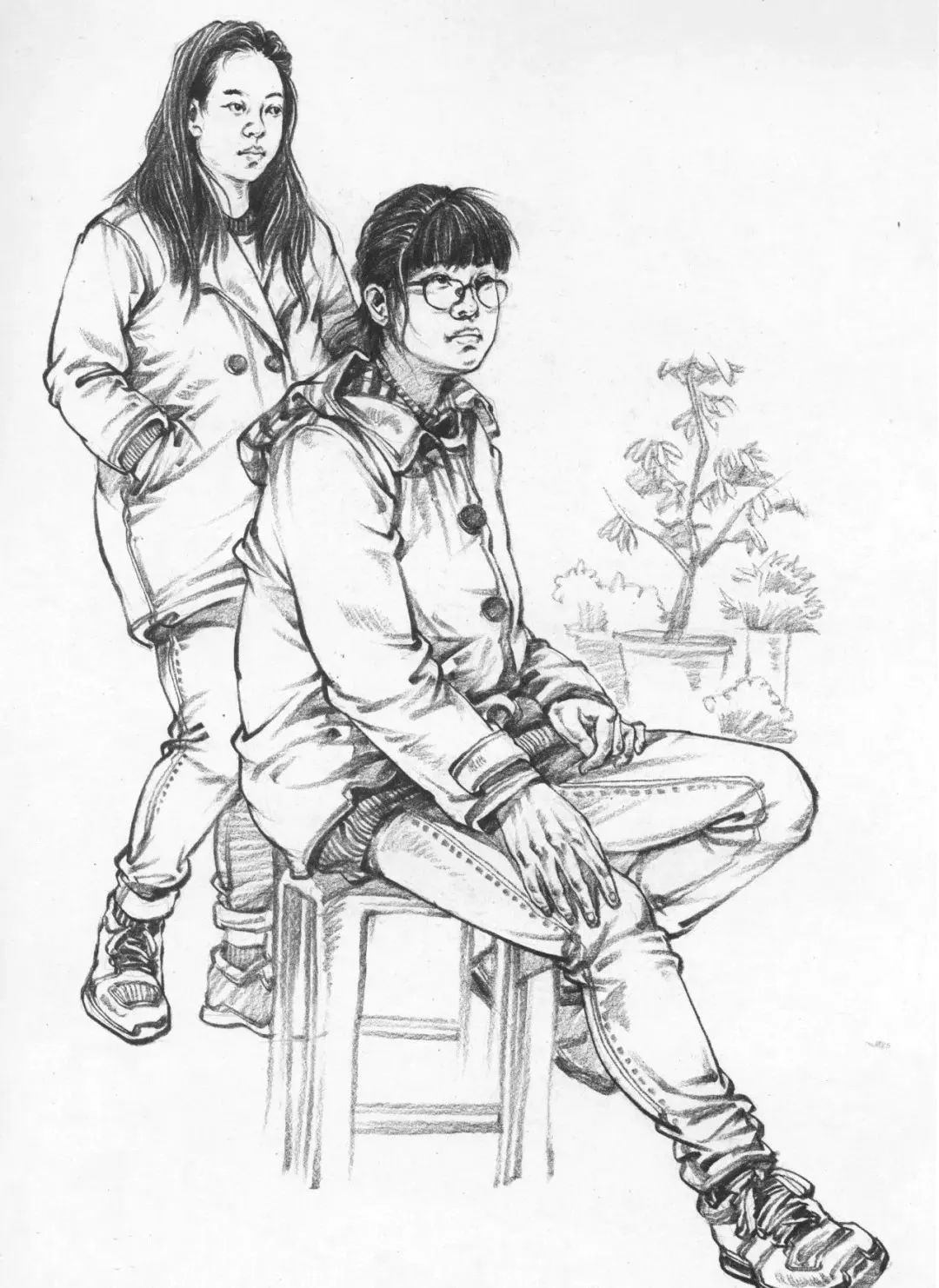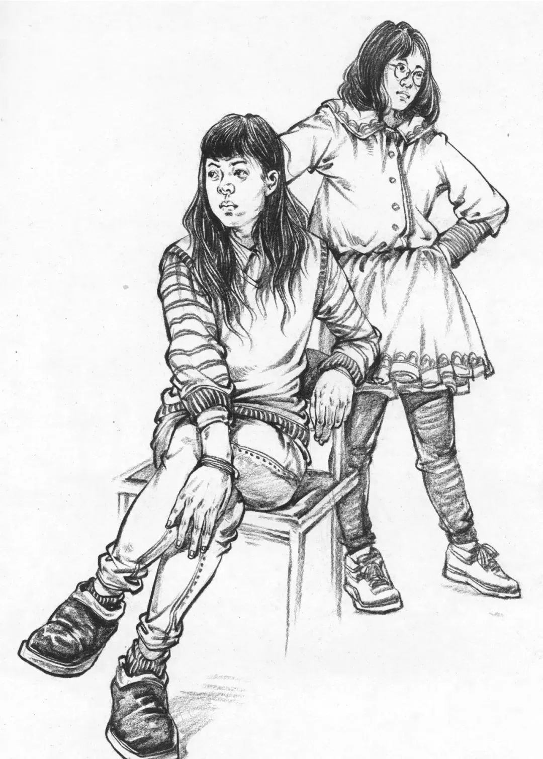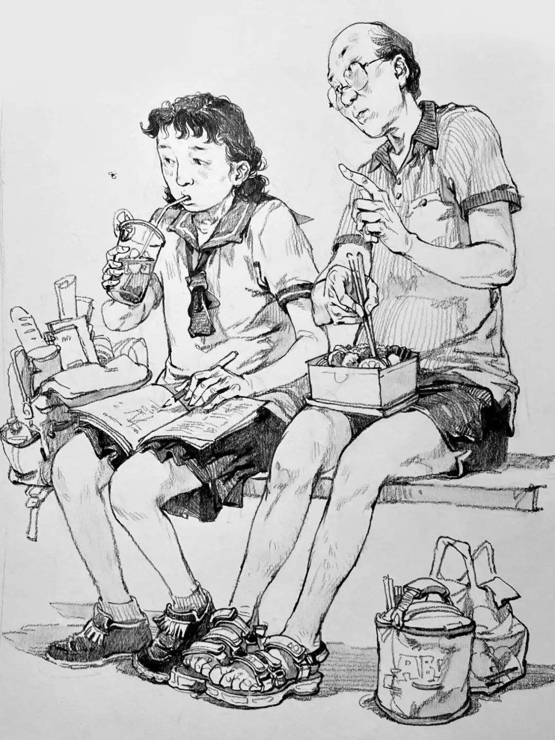 最后是雙人速寫一定要注意比例,因為一般是站姿+坐姿的組合,兩個人本身來說身高、體重、比例就會不一樣,那么我們在把他們組合起來的時候更要注意這些問題,不能看上去不在一個空間里,或者是比例很奇怪,所以空間透視一定要畫對,不然這樣的速寫也是不耐看的。