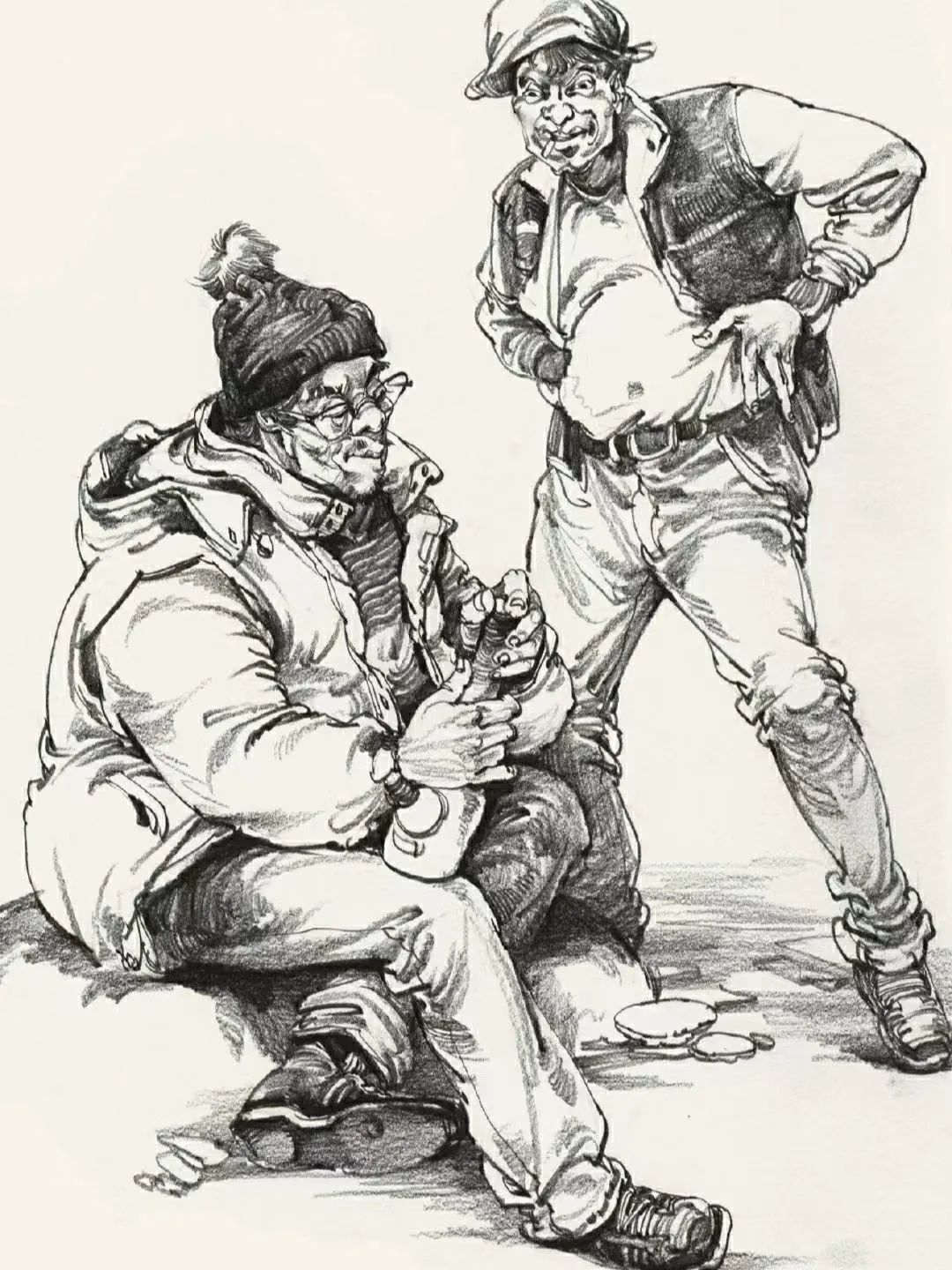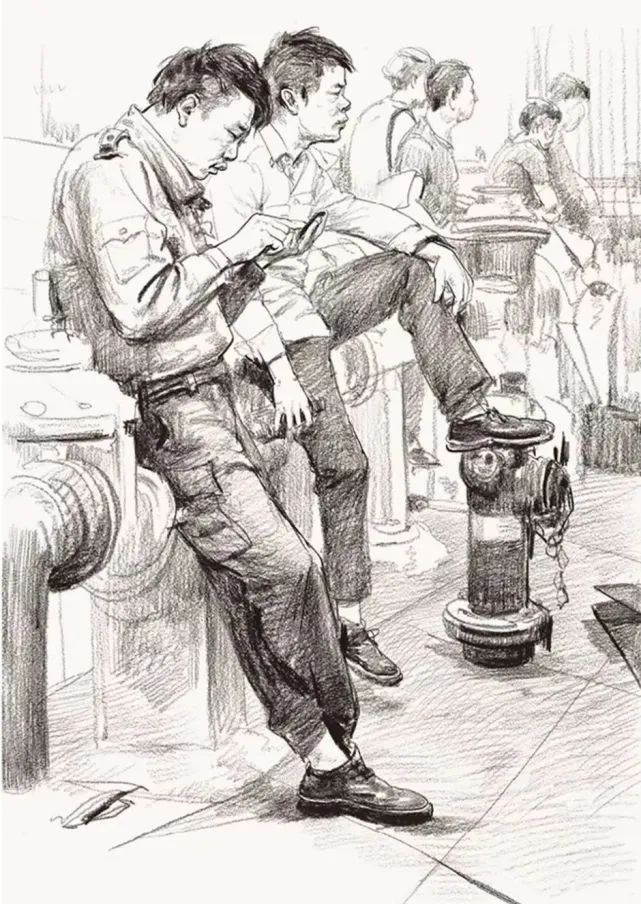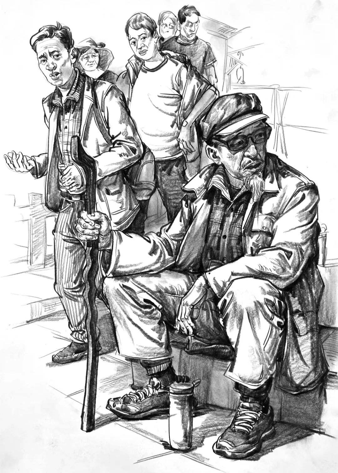 首先我們的畫面一定要有互動,這是組合速寫與單人速寫最大的不同,不是說把幾個人放在一張畫里就是組合速寫,而是這幾個人之間一定要有交集,哪怕眼神沒有互動,在肢體和環(huán)境中也一定要把這種互動的關(guān)系表現(xiàn)出來。