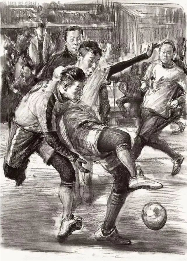 下圖這張速寫是難度比較高的,我們只看畫面中考前的四個人物,最前面的兩個人在搶球,很明顯他們是最主要的,不管是在五官、頭手腳、服飾、動態(tài)的塑造上都是非常完整的,而后面兩個人起到了襯托的作用,左后方這個人的身體被擋住了,所以把衣服加重,往后虛掉,右后方的人物有一定的動態(tài),衣服畫白一點(diǎn),與背景有一定的區(qū)分,同時填補(bǔ)了這個區(qū)域的空缺,四個人構(gòu)成了一個非常舒服的畫面,這個時候再加一些背景、投影就很好處理了!