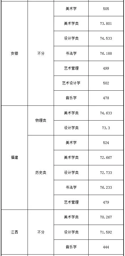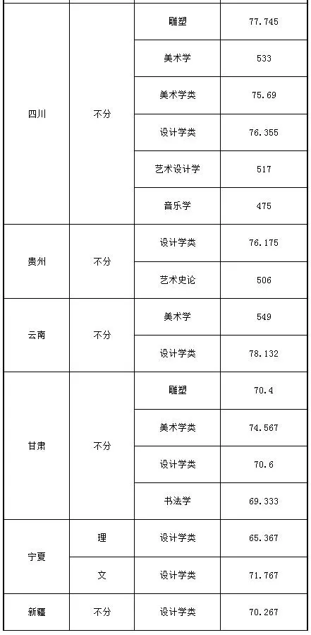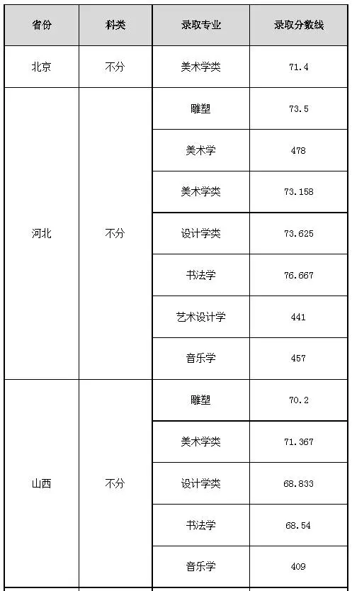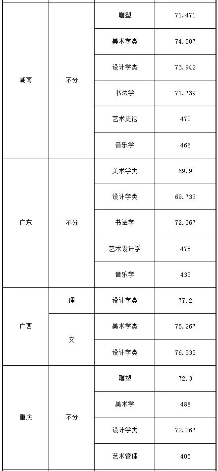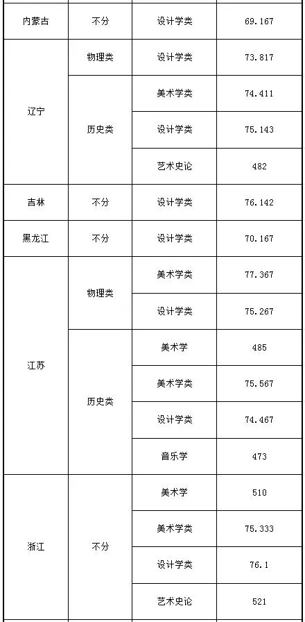 注:1.按遼寧省、河南省、湖南省的錄取規則,美術學類、設計學類、雕塑、書法專業的綜合分計算方法為:綜合分=文化總分×0.067+省統考總分×0.167。