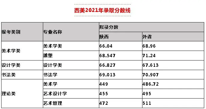 2021年西安美術學院各專業錄取分數線: