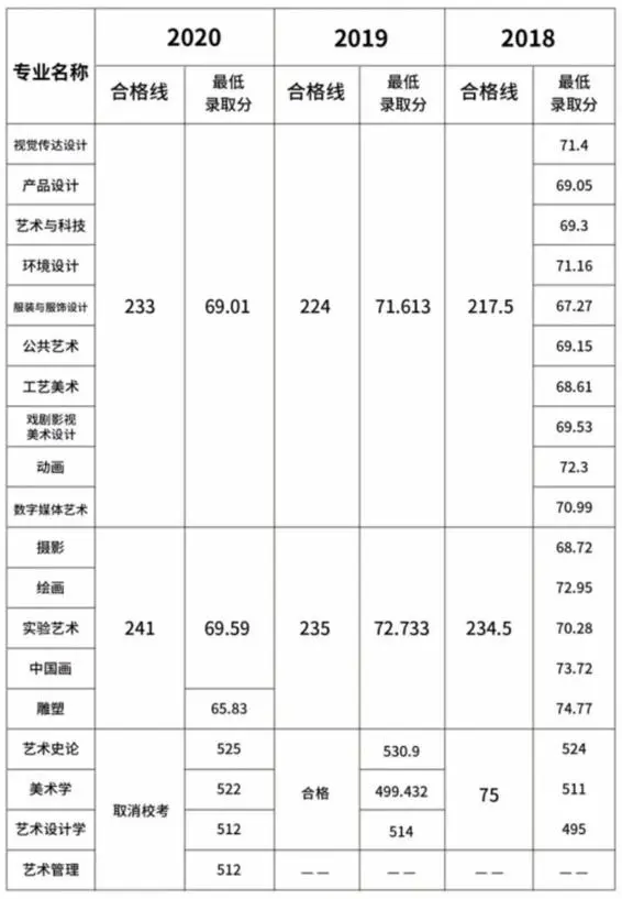 1.美術學類:美術與設計類專業省統考成績達到本科合格線,高考文化課成績達到所在省藝術類本科最低控制線,按綜合分[綜合分=(文化課總分÷文化課滿分×50)+(省統考總分÷省統考滿分×50)]從高分到低分排序擇優錄取,如綜合分出現并列情況,按高考文化課成績位次排序錄取。